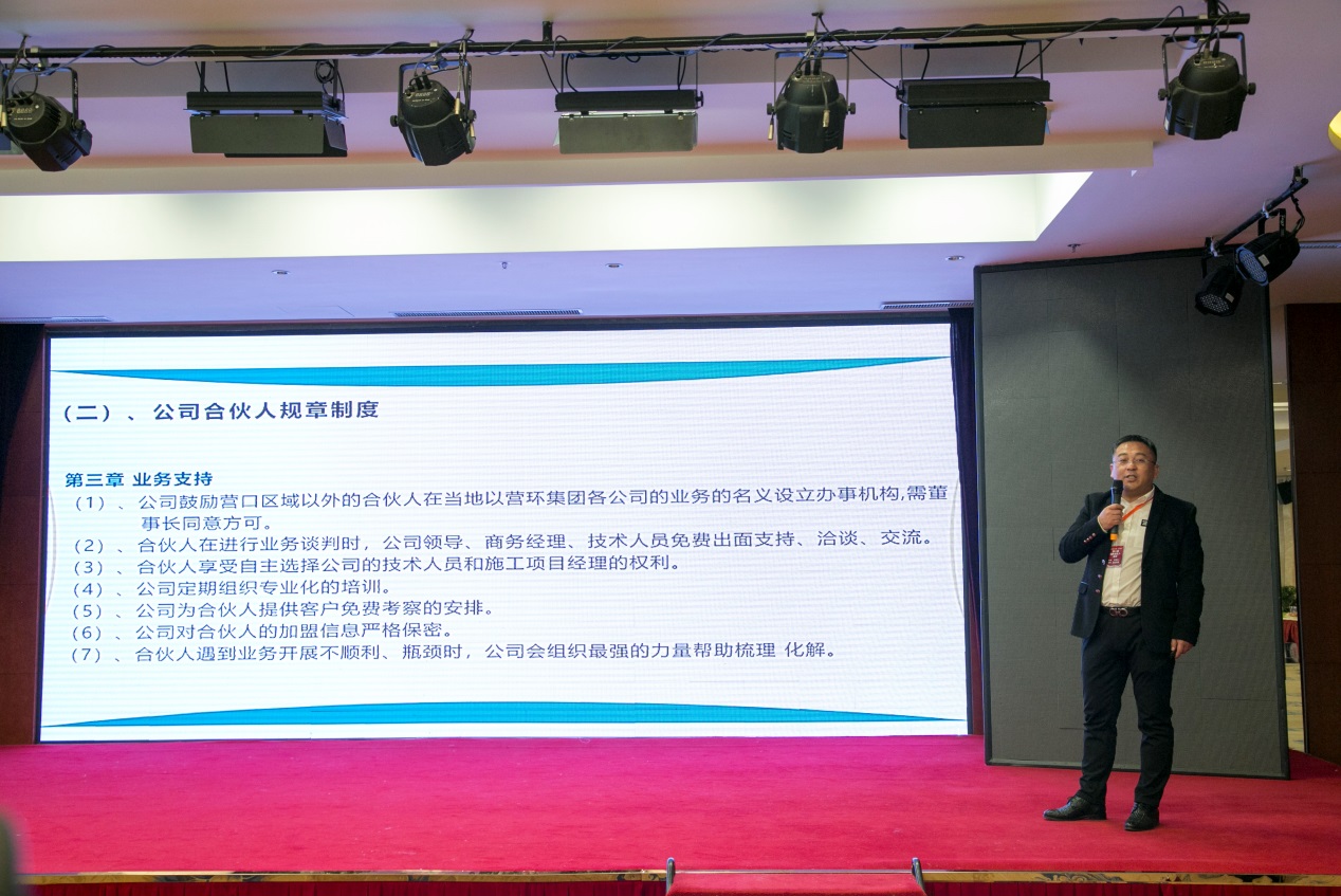 營口市環(huán)境工程開發(fā)有限公司賈喜東商務副總做《如何輕松達到事業(yè)另一個頂峰》報告,報告中就如何尋找項目、如何提高項目成功率及如何跟蹤已簽約項目、讓老客戶再次購買和轉介紹,進行分析講解。
